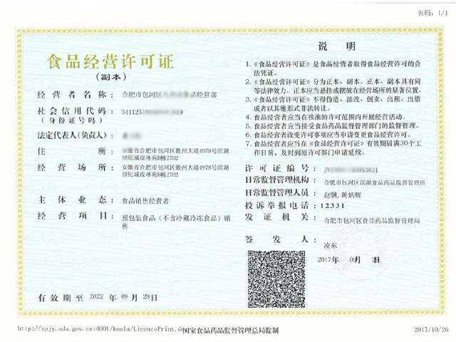此为合肥食品经营许可证样本